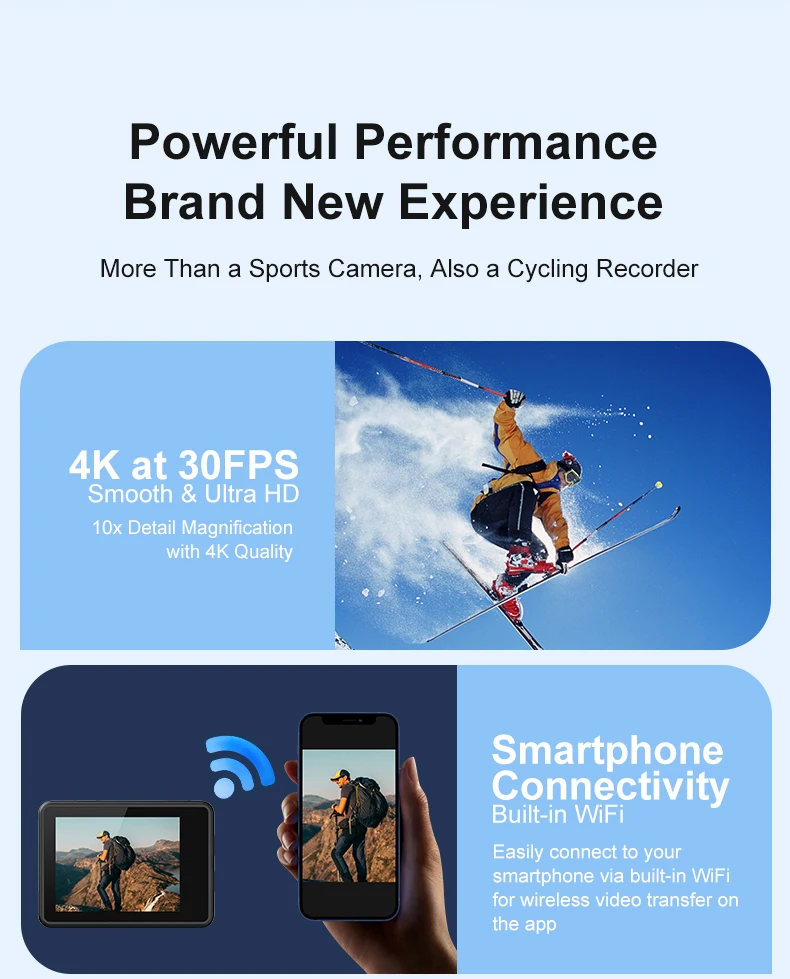 A estrutura robusta e à prova d'água de 30 m resiste a impactos de lama, neve e água.Perfeito para diversas atividades como andar de bicicleta na chuva, nadar, esquiar e mergulhar.